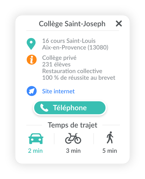 Nos algorithmes identifient le site Internet et les réseaux sociaux de chaque point d'intérêt et en extraient de multiples informations utiles comme le tracé d'une ligne de bus, le taux de réussite au bac d'un lycée, le niveau de certification de soin d'un hôpital, le site Internet d'une mairie...